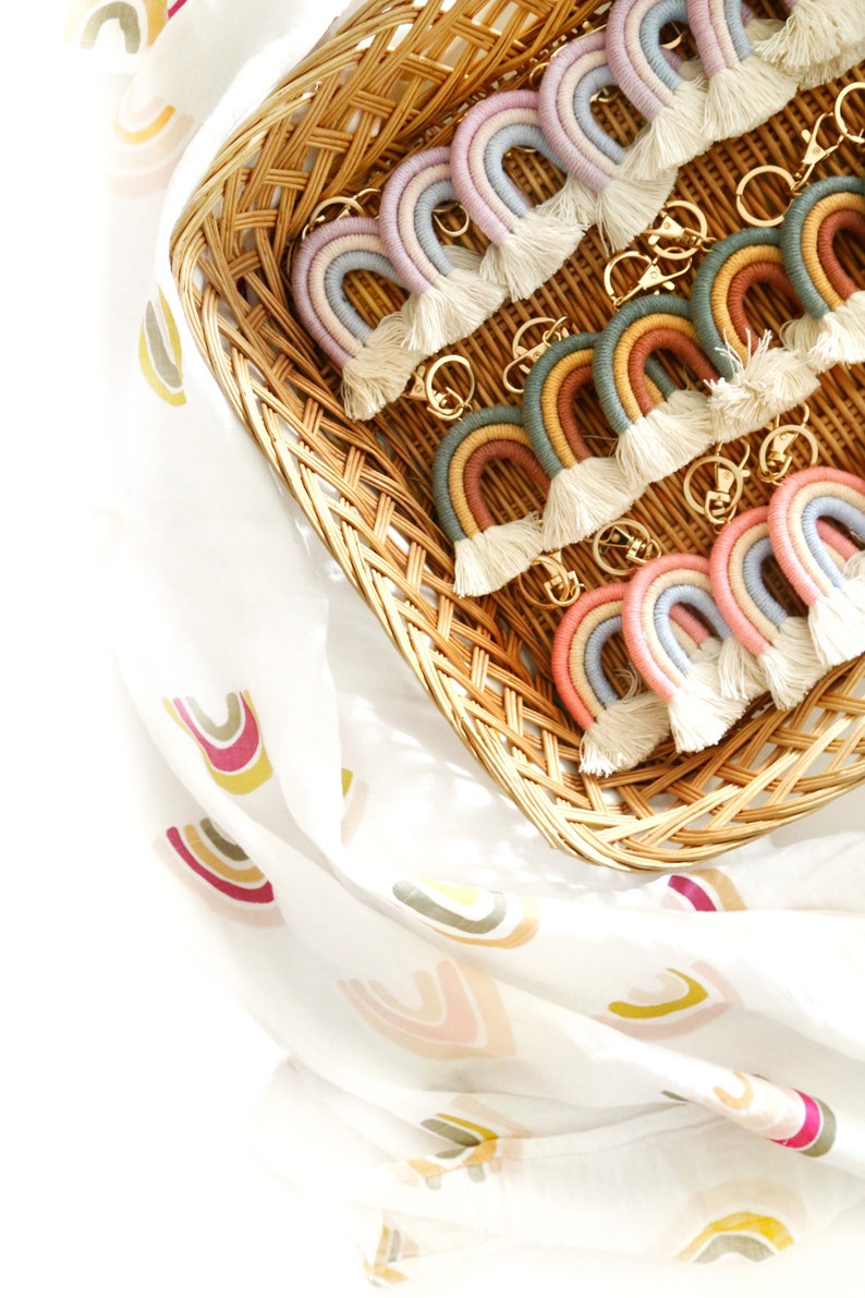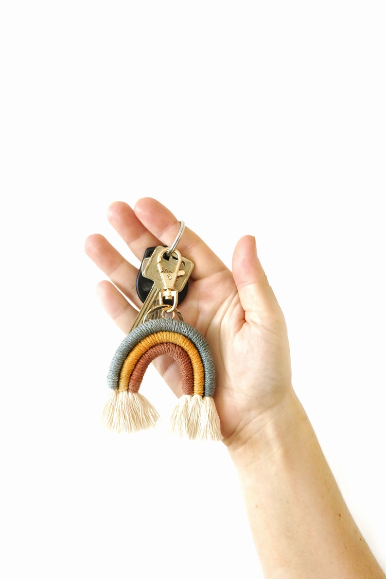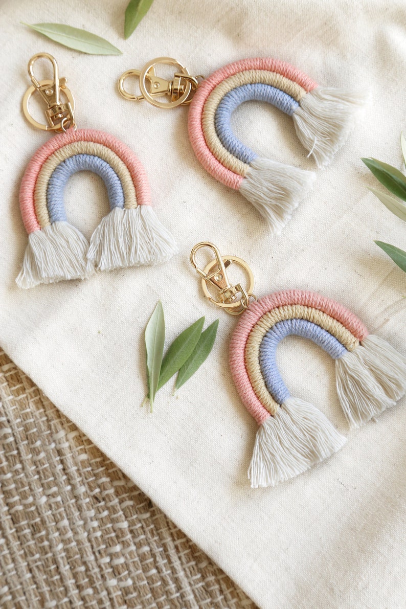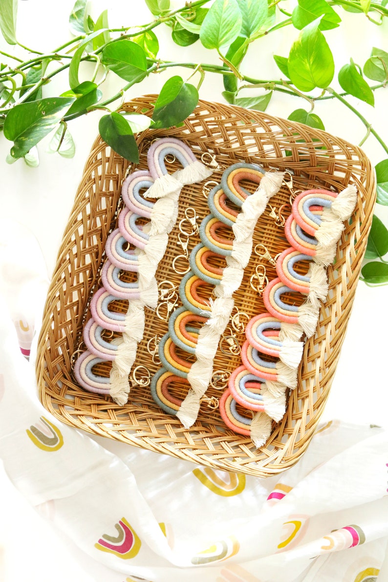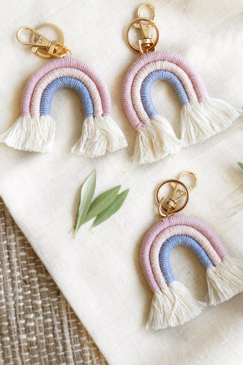 Vous cherchez un joli porte-clés coloré ? Cet adorable arc-en-ciel en macramé est l'accessoire parfait à ajouter à vos clés, votre sac, et plus encore!