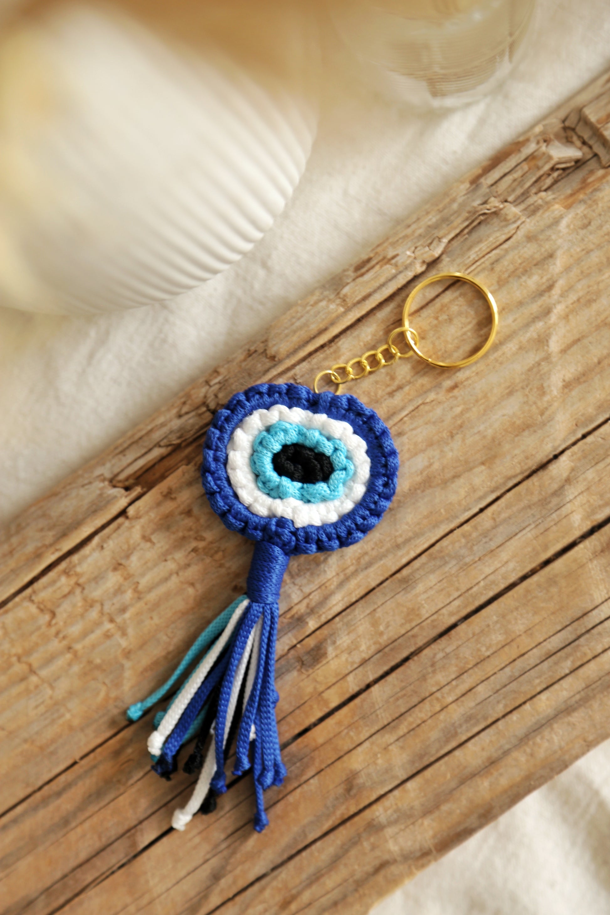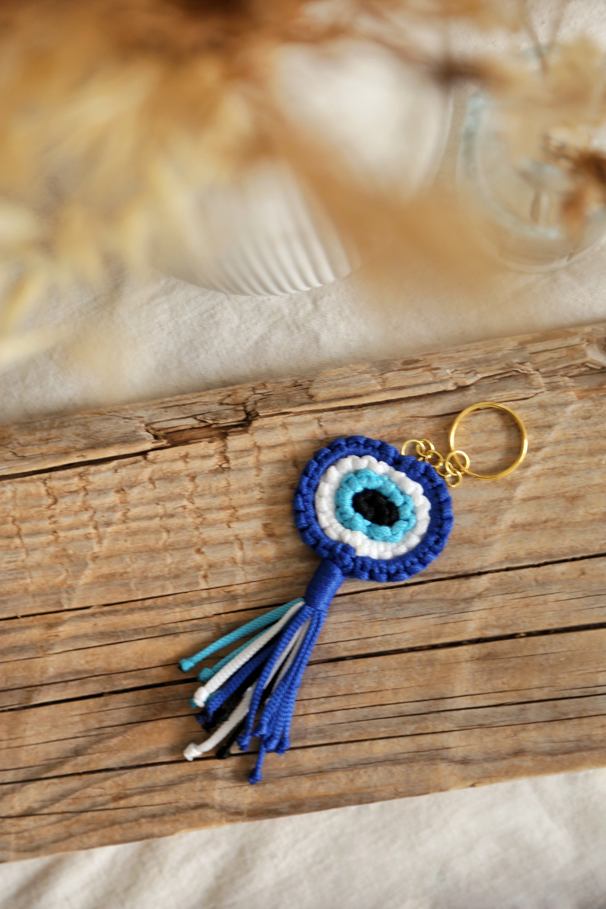 Fabriqué avec soin à partir de fils en polyester résistants, ce porte-clé allie artisanat, durabilité et esthétique méditerranéenne. Son design graphique et ses nuances de bleu en font un accessoire à la fois tendance et chargé de sens.