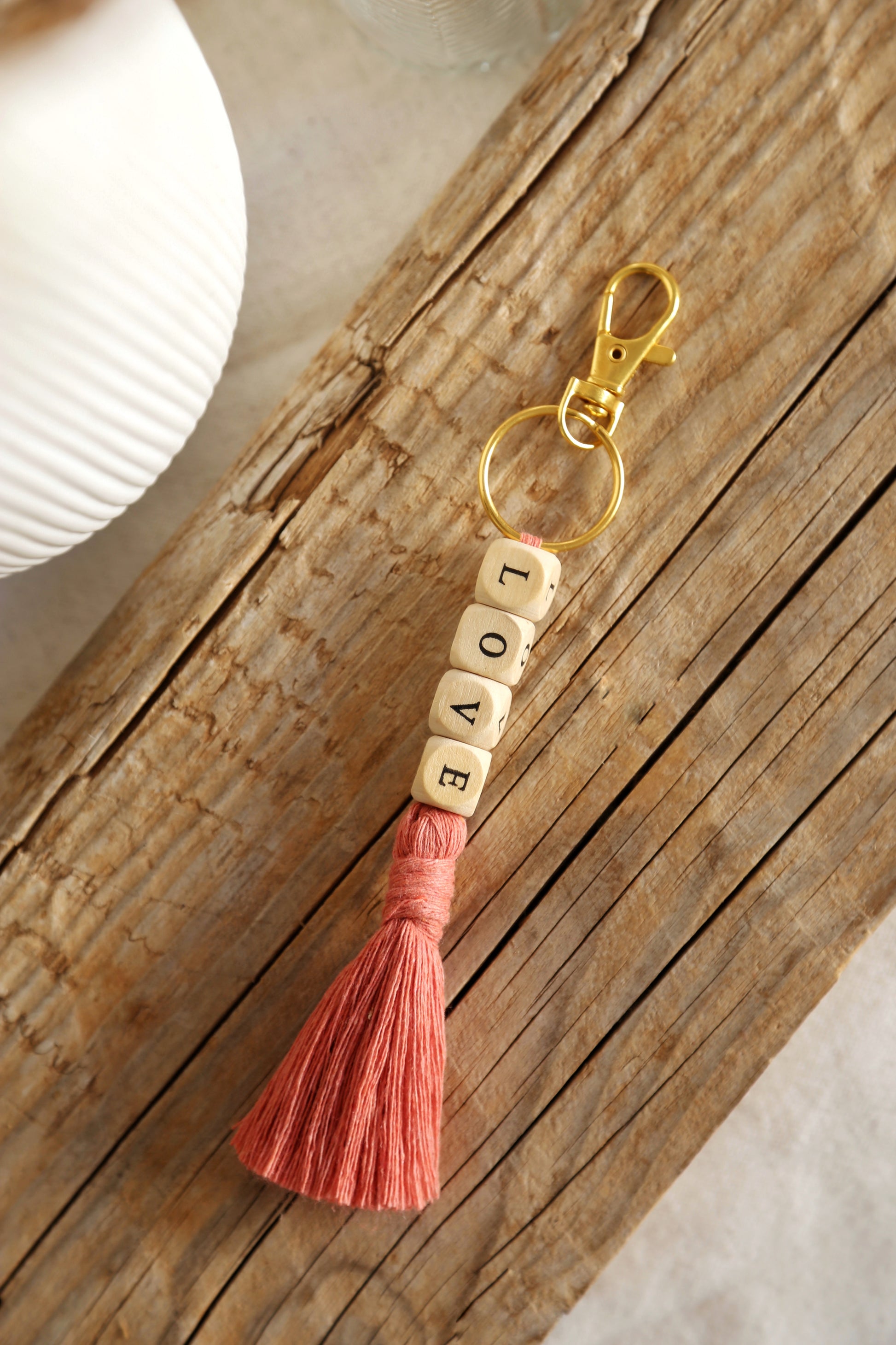 Ajoutez une touche d’amour à vos clés, sacs ou cadeaux avec ces adorables porte-clés en macramé ! Chaque modèle est délicatement noué à la main et orné de perles en bois formant un petit mot doux : LOVE, BABE ou XO.